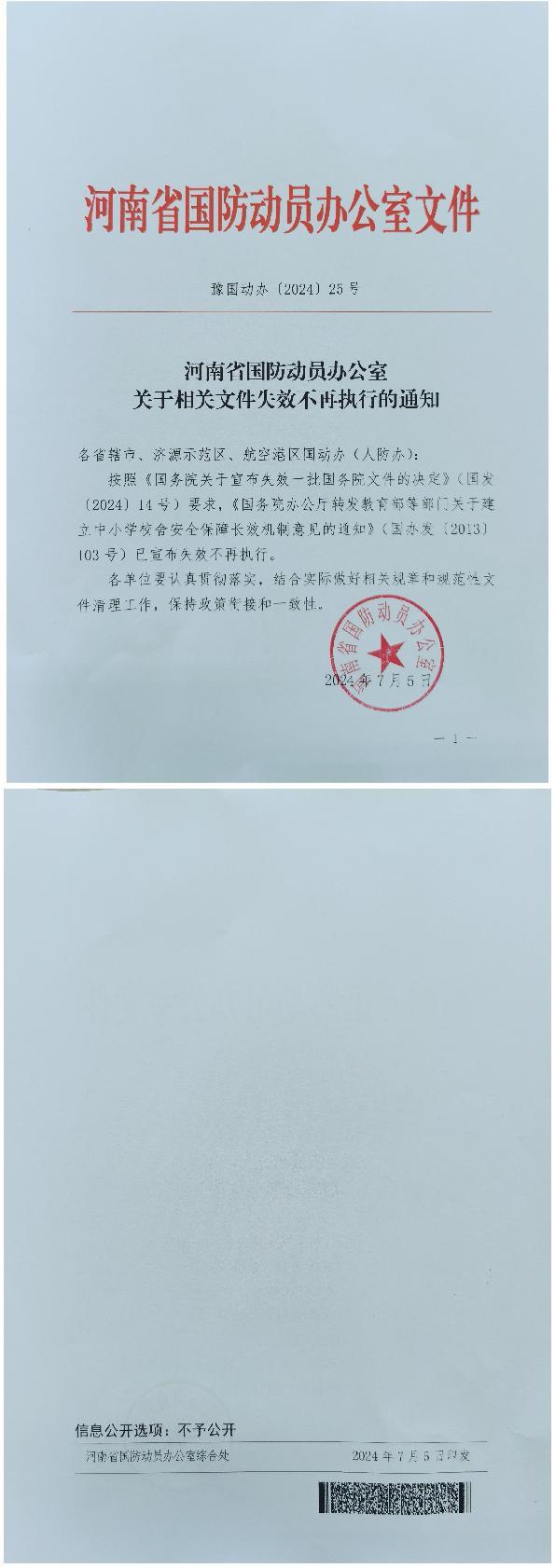 河南省国防动员办公室关于相关文件失效不再执行的通知